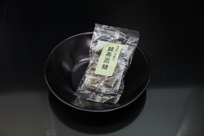 大分県日田産の緑茶を粉末にし沖縄県産黒糖に練り込んでいます